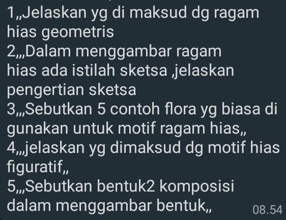 Motif flora, fauna, geometris dan figuratif itu maksudnya apa? Dapat menjadi gaya yang berdiri sendiri dalam suatu karya seni 2 dimensi . Lalu, apa sebenarnya yang dimaksud dengan ragam hias? Ragam hias adalah bentuk dasar hiasan yang biasanya akan menjadi pola yang diulang dalam suatu karya seni atau kerajinan. Indonesia sangat kaya dengan keragaman produk kerajinan dengan berbagai macam ragam hias yang tersebar . Ragam hias merupakan karya seni rupa dari penggambaran bentuk imajinasi, pikiran, dan kreativitas seniman. Adanya variasi ragam hias pada suatu karya seni juga dapat menambah nilai jual. Motif ragam hias pada produk kerajinan dari bahan lunak. Motif tumbuhan yang merupakan hasil gubahan sedemikian rupa jarang dapat dikenali dari jenis dan bentuk tumbuhan apa sebenarnya yang digubah atau .